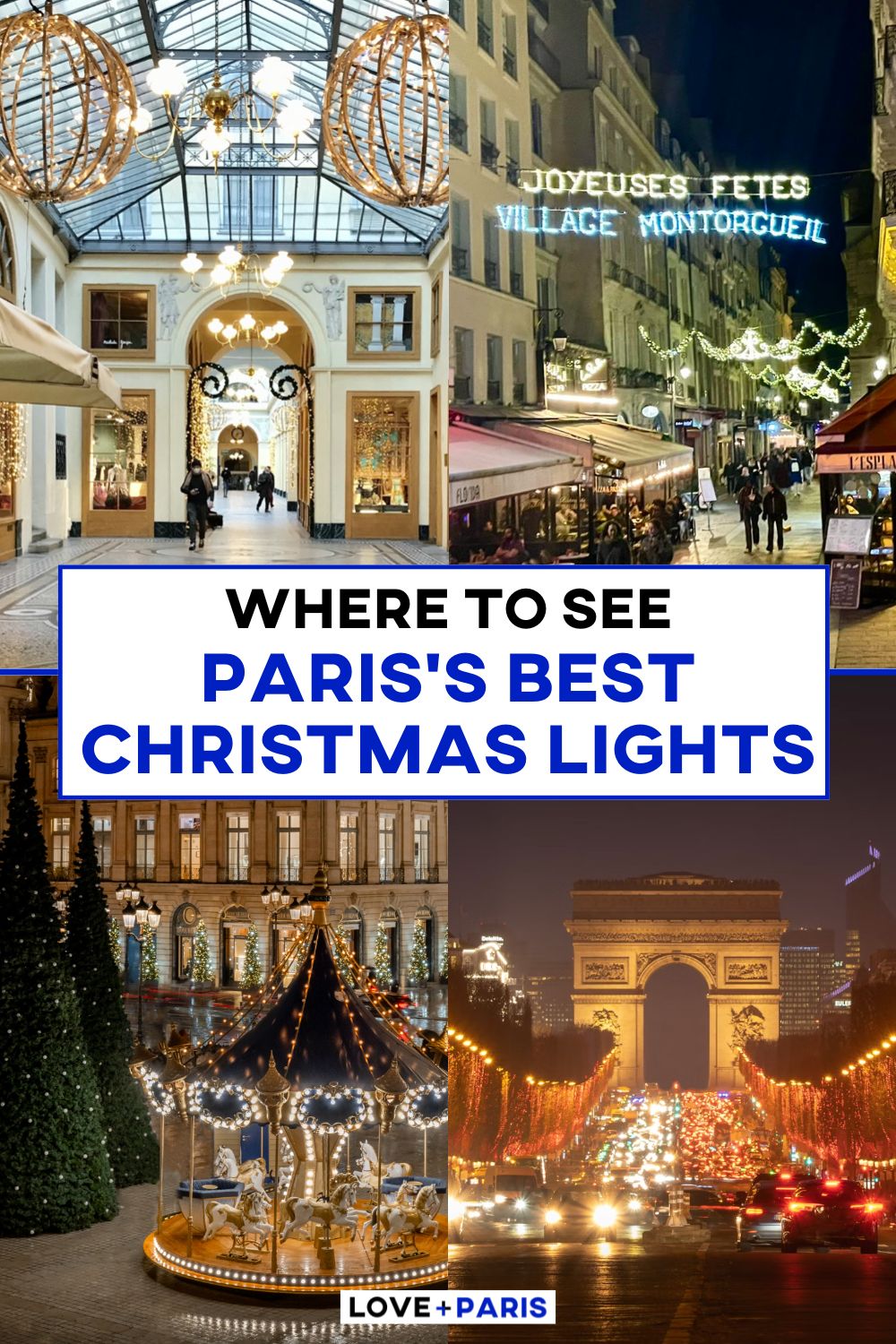 I really LOVE this lively market street in central Paris year-round, but the ambiance is extra special over the festive season. Included on Day 4 of our Paris Itinerary, the magic starts at the beginning of the street with lights spelling out the street’s name. Then, wander down it slowly, savoring all its pretty holiday lights as you go. You’ll likely be tempted into some of its decadent food shops or stop in at a café for a steaming vin chaud (mulled wine). It really is the Paris holiday spirit at its best.